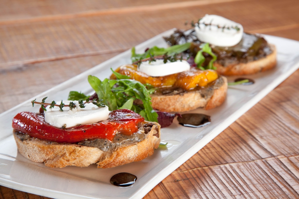 Намазать тосты пастой из баклажан, положить кусочки перца. Сверху - ломтик мягкого козьего сыра.