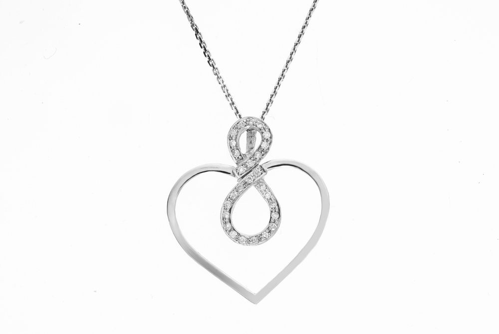 Одно из центральных украшений праздничной коллекции - кулон, символизирующий любовь. Простую на первый взгляд форму сердца венчает фигура "восьмерки", инкрустированная небольшими бриллиантами в 14 карат. В рамках мероприятия изысканное украшение из белого золота можно приобрести по цене 1.950 шекелей вместо 4.876.