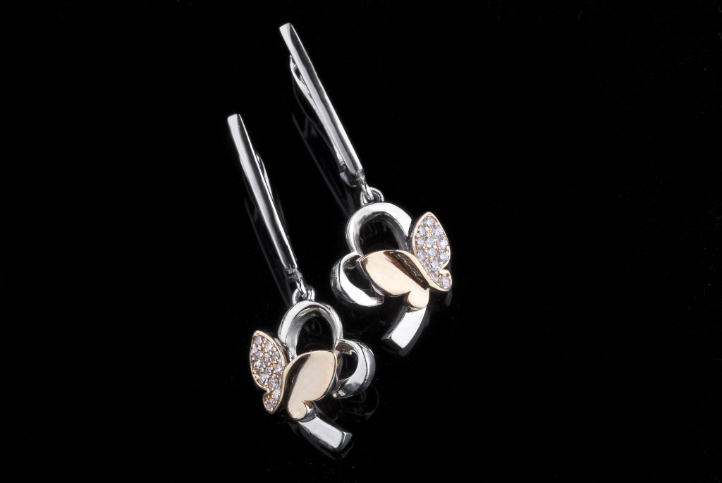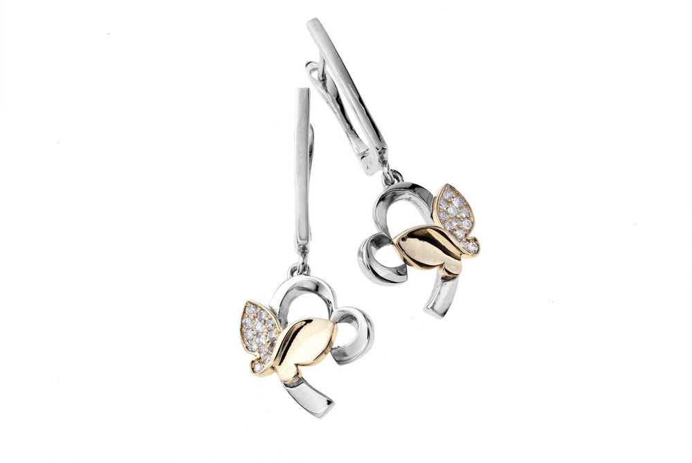 Одно из самых ярких украшений коллекции – миниатюрные сережки в форме сердечек с изящными бабочками. Основа украшения, застежка и сердце, сделана из белого золота 14 Карат. Бабочка, инкрустированная россыпью бриллиантов (0.13 карат), - из желтого золота.