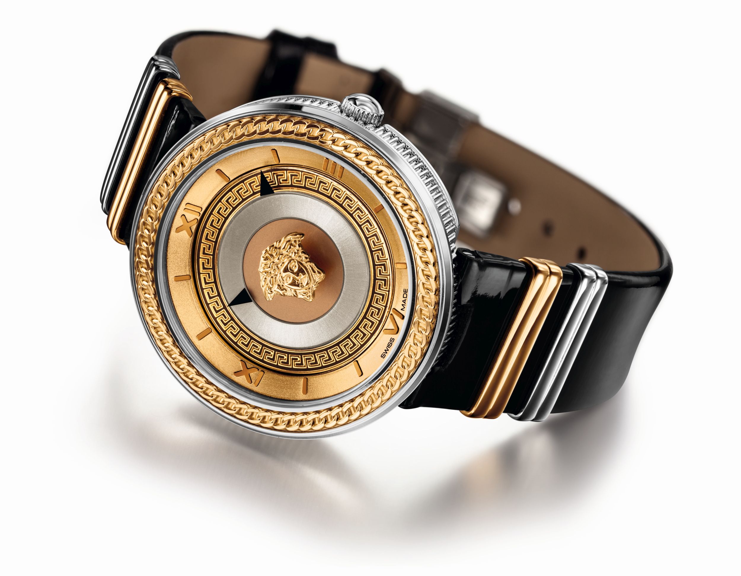 Внимание мгновенно приковывает рельефное изображение головы Медузы, словно парящее в центре циферблата. Оно окружено лаконичным греческим орнаментом – еще одним фирменным знаком Versace. Внешний контур циферблата украшен цепью классического плетения.
