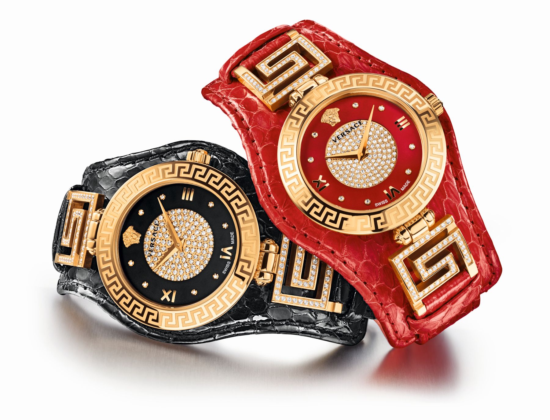 В остальном обе модели схожи: почетное место цифры двенадцать традиционно отмечено логотипом Versace – рельефным изображением головы медузы Горгоны. Периметр корпуса украшен орнаментом греческого ключа, еще одного фирменного знака бренда.