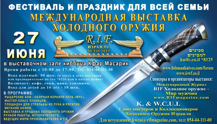 27 июня 2015 года в Выставочном зале киббуца Кфар-Масарик пройдёт международная ножевая выставка «R.I.F. – Лето-2015», организованная международным журналом о холодном оружии «R.I.F. Холодное Оружие: Мир Мужчин», выставка, которая уже давно стала фестивалем и праздником для всей семьи…