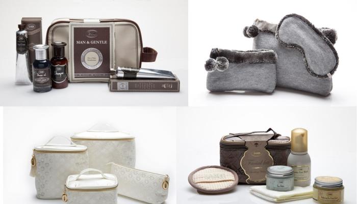 Кроме того, дополнить свои наборы можно шикарными сумками для душа в черно-золотых цветах 4-х размеров, косметичками и мягкими повязками для глаз для сна в самолетах – вязаными и меховыми, в серых цветах.